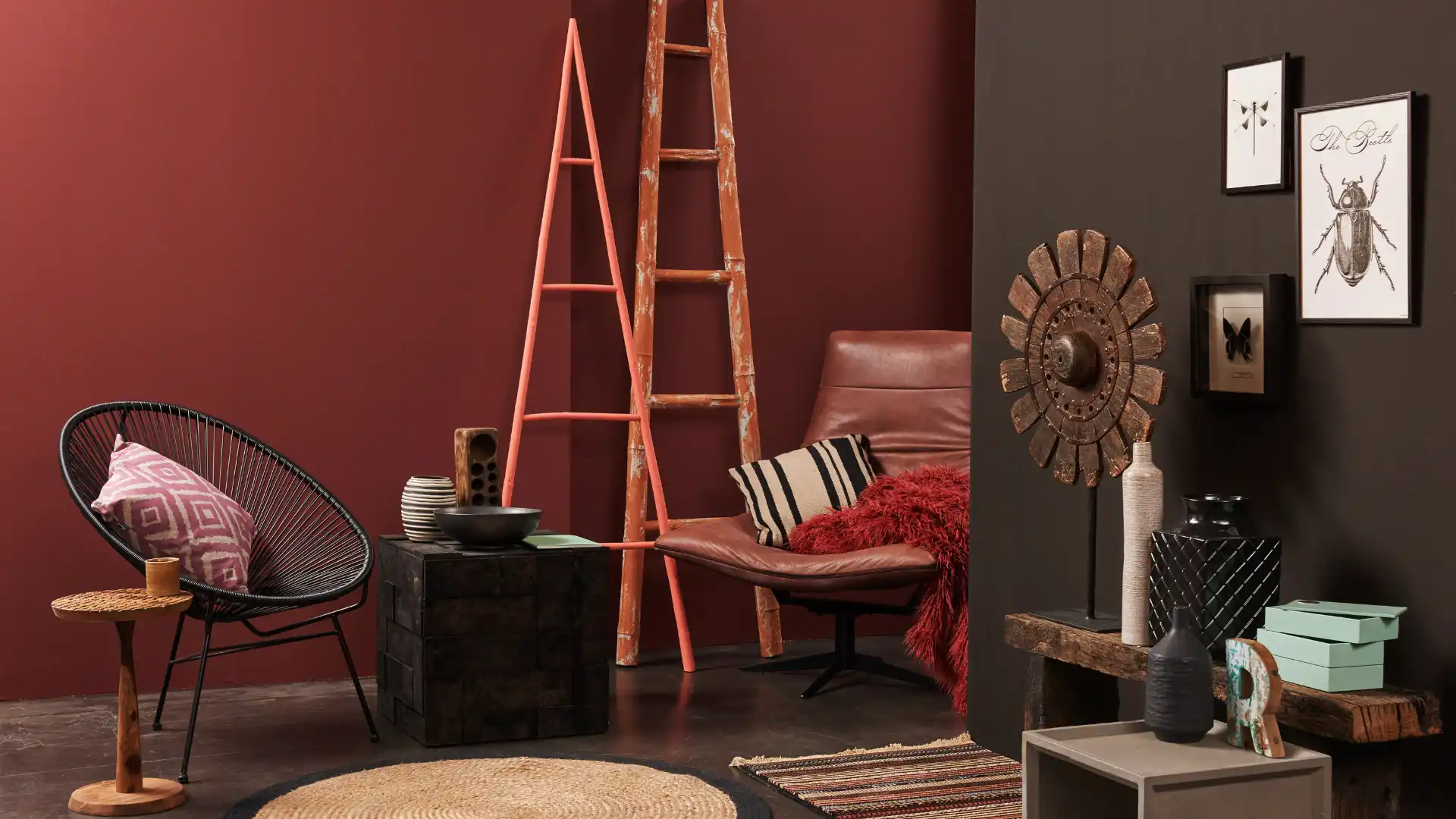 Donkerbruin en warm donkerrood zorgen voor een spannend nieuw interieurgevoel. Materialen gebruikt zoals in Afrika; bamboe, kurk, leer en sisal. (Gebruikte kleuren op de wanden: N36080 en H00760.) De bamboe trappen zijn met een grove kwast bewerkt in koraal (TC16014) en hazelnoot kleur (N39060)!
