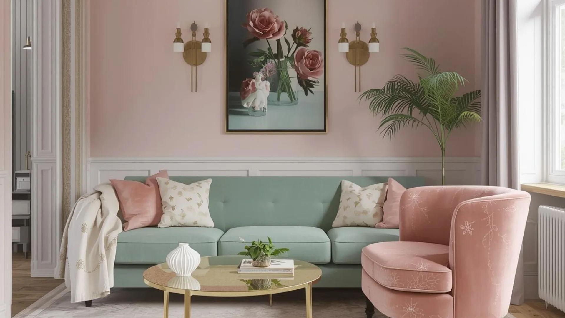 Interieur met pasteltinten meubels en pastinten verf op de muur
