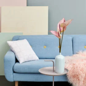 Moderne vertalingen van romantiek door de combinatie van strakke geometrische vormgeving van meubilair en accessoires met romantische zachte kleuren en accessoires. Zachte, warme pastelkleuren steken af tegen koele grijzen of worden bruusk doorbroken met bloedrood of zwart.