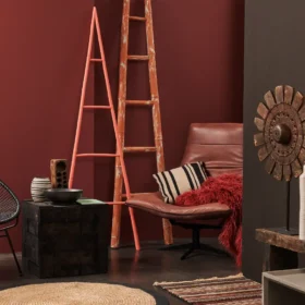 Africa meets design. De leren fauteuil is van Bodilson, het houtsnijwerk tafeltje en de tapijtloper zijn van Zuiver. De wanddecoratie met insecten is een nieuwe trend!
