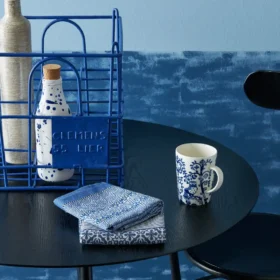 Mooi contrasterend: stoere industriële materialen naast het delicate van het Japans en Chinees porselein en dessins. Blauw is de verbindende factor in denim, indigo, Delfts blauw, maar ook voor blauwgroene tinten is er ruimte.